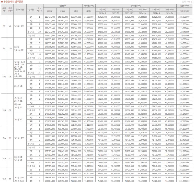 계약금 10%,중도금50% 이자후불제,중도금 9천OR 연체,입주 전 최소 필요자금 9천~1.8억,입주시 필요자금 4억이상,입주시 전세불가능합니다.투기 과열지구로 dsr40%로 적용 입주시 실거주 조건입니다.