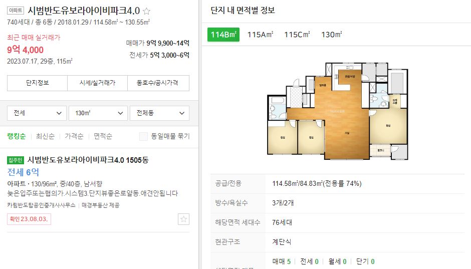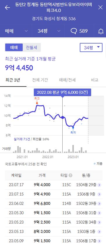 시세를 알아보겠습니다. 34평은 21년 9월 12.1억 최고점에서 23년 1월 7.5억까지 빠졌다가 현재는 9.5억으로 20년 가격으로 회복해서 현재 전세호가 5.3억, 매매호가 약10억 입니다.