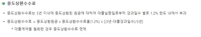 답변:3년 이내에 중도 상환된 원금에 대하여 대출실행일로부터 경과일수 별로 1.2%한도 내에서 부과