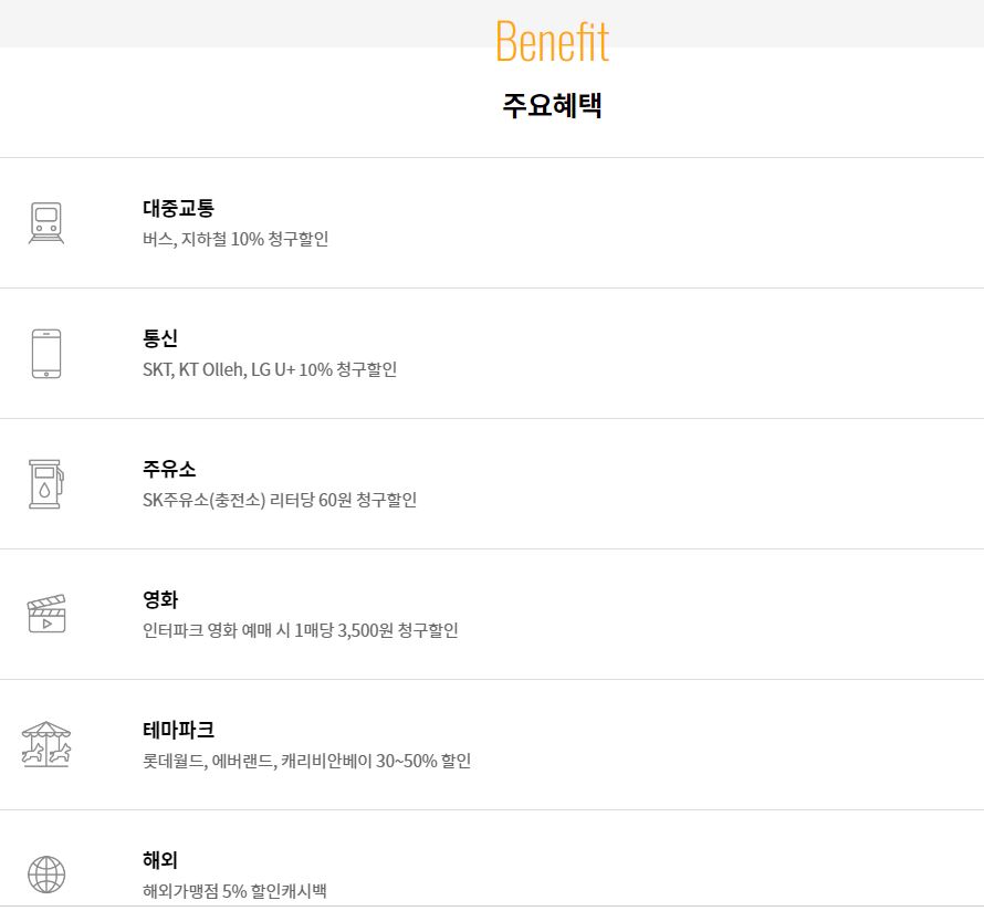 버스,지하철10% 청구할인, 통신 10% 청구할인,인터파크 영화 예매시 1매당 3,500원 청구할인,테마파크 30~50%할인,해외가맹점5% 할인캐시백 입니다.