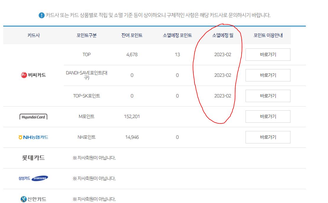 5.카트 포인트 통합 조회를 누르면 아래와 같이 카드사별로 포인트 및 소멸예정일까지 나오네요.