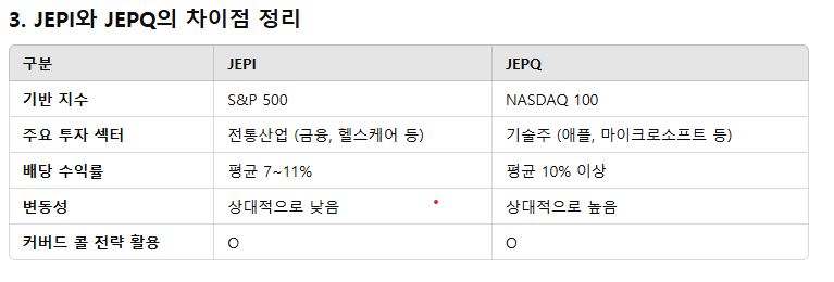 두 ETF 모두 커버드 콜 전략을 통해 안정적인 수익을 창출하지만, 투자자의 성향에 따라 선택이 달라질 수 있습니다. **안정적인 배당**을 원한다면 JEPI, **고수익과 성장성**을 동시에 노리고 싶다면 JEPQ가 매력적인 선택이 될 것입니다.