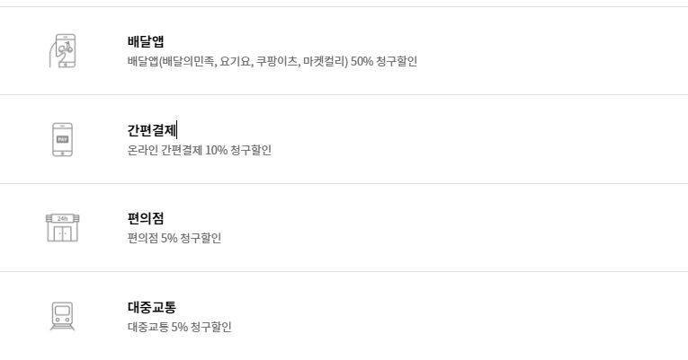 배달앱 50%할인, 온라인간편결제PAY 10%청구할인,편의점,대중교통5%청구할인