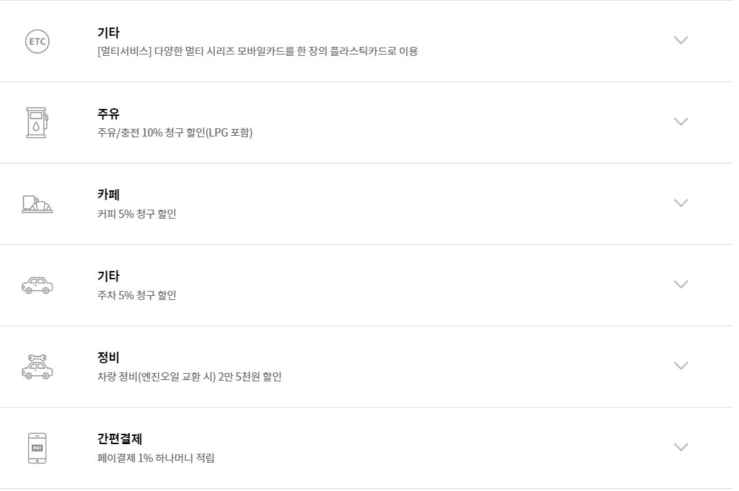 주유 10%할인,스피드메이트,주차장이용금액 10% 결제일 할인,편의ㅣ점 5% 결제일 할인,스타벅스,이디야 5% 결제일 할인,택시5% 결제일 할인, 롯데시네마일ㄱ반관 5천원 현장할인이 있습니다.